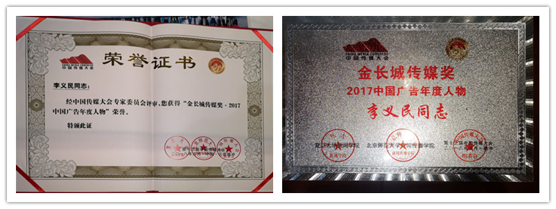半岛(中国)官方传媒受邀参加大会,并斩获“金长城传媒奖·2017中国十大传播力户外传媒”奖项,董事长李义民先生获得“金长城传媒奖·2017中国广告年度人物”奖。